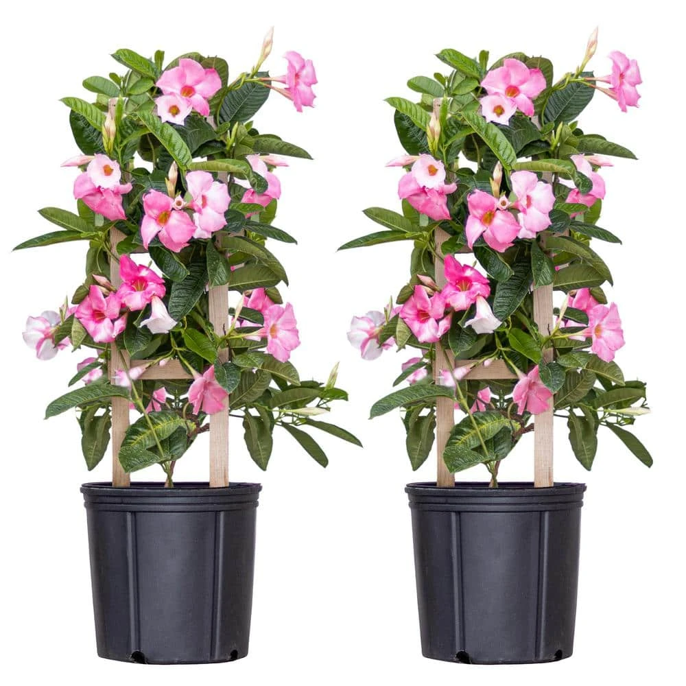 This 2-pack of Sun Parasol Giant Pink Mandevillas produce large Pink flowers that span up to 5 in. and create an elegant tropical look. Natural climbers, these beauties are stunning trained to a trellis or obelisk in patio pots. Nothing says summer like Giant Pink Flowers. Bring these lovely plants poolside and create a tropical paradise. Mandevilla’s enjoy light and heat and perform best in warm temperatures between 65° to 90° and high direct light levels. Mandevilla needs to be planted in full sun in order to flower well. It will tolerate a range of soils, as long as the soil is well drained. Mandevilla needs to be watered and fertilized regularly. Plants help decrease stress and anxiety while stimulating creativity and productivity. Great for yourself or as a gift.